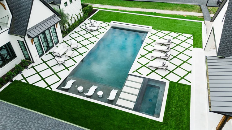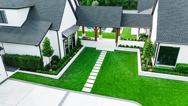 In addition to plant care and irrigation management, maintaining the precision of the synthetic turf and hardscape detailing is an ongoing focus. The turf is regularly groomed and cleaned to retain its lush appearance, while hedges and bed edges are meticulously maintained to preserve the sharp lines that define the property’s visual character.