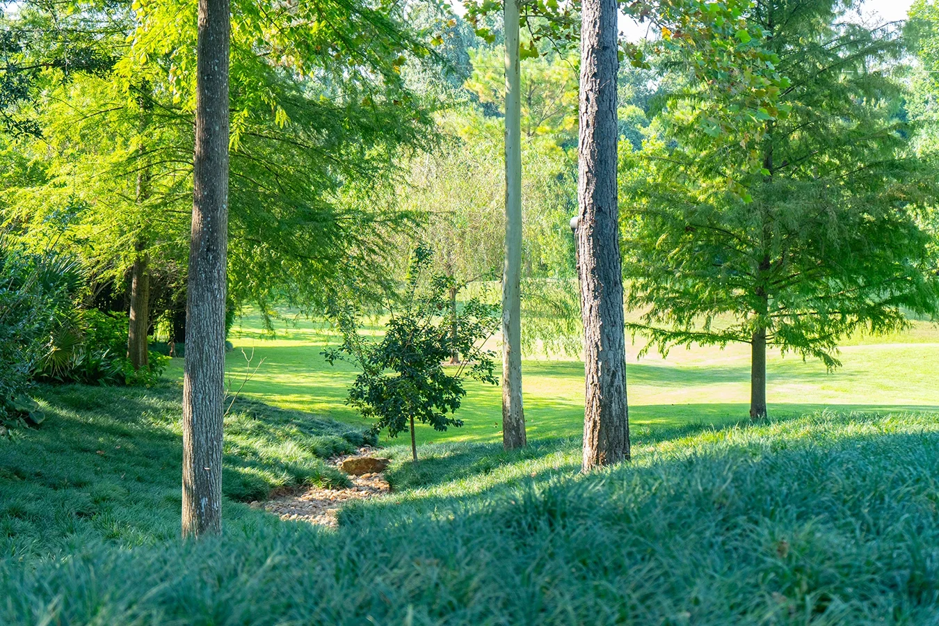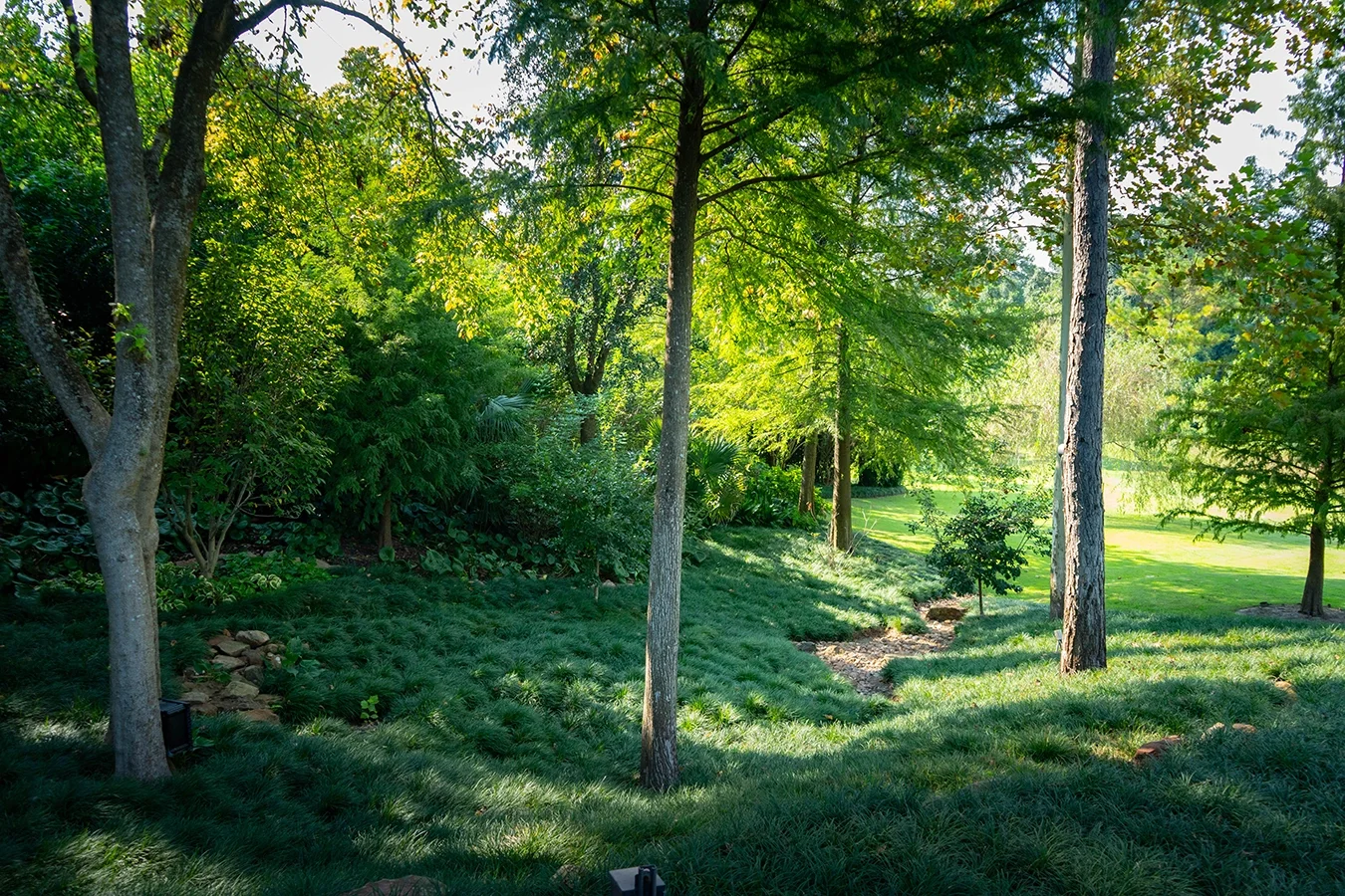 The site’s steep grade—nearly a 60-degree slope down to the bayou—posed major logistical hurdles. With limited equipment access, all soil, debris, plants, and materials had to be moved by wheelbarrow up and down a 300-foot hill. Crews also installed moss boulders to slow stormwater runoff and reduce erosion.