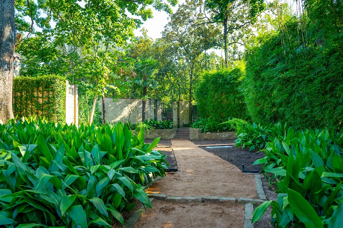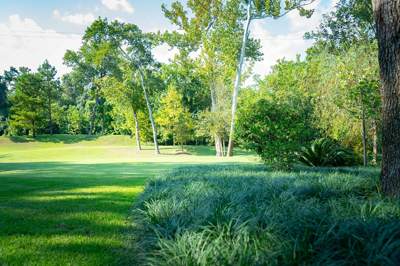 The property’s location on the bayou added another layer of complexity. It is prone to flooding, and during Hurricane Beryl, floodwaters reached within 50 feet of the house. The fully landscaped backyard, which featured bamboo, willows, river birch, maples, and pines, was inundated with water approximately 40 feet high in the middle of the yard. Many plants were knocked down by the surge, requiring crews to reset, clean, and stabilize extensive plantings. Additionally, floodwaters deposited invasive bahia grass seed from a neighboring property into the beds. This invasive grass overtook the monkey grass groundcover, forcing Hogue’s team to eradicate the infestation, replant, and seamlessly blend the new areas with existing beds—an effort that involved installing more than 10,000 new monkey grass plants on top of the original 30,000.
