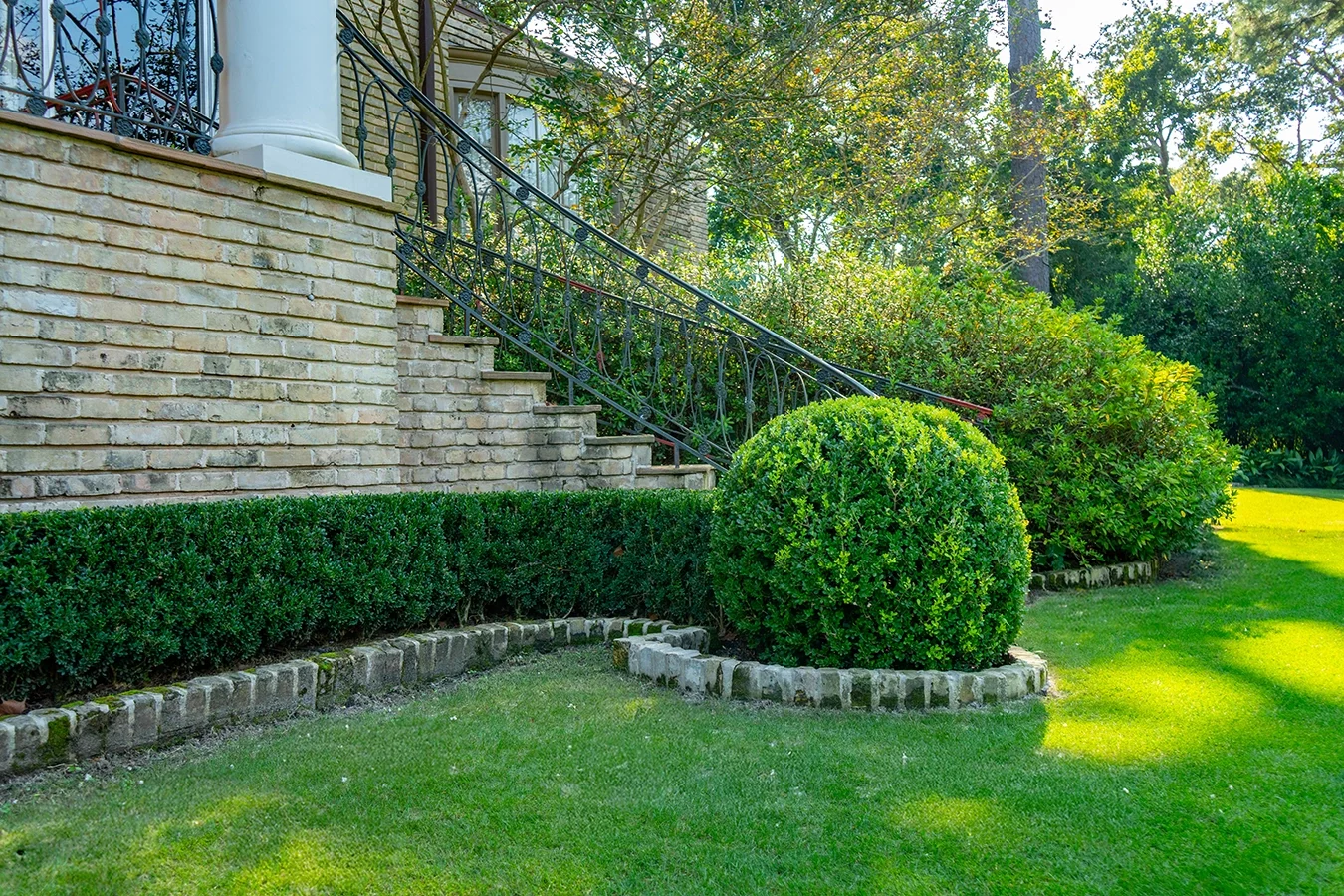 The front yard required immediate visual maturity. Following the 2021 freeze, large plant material was scarce. Initially, 7-gallon yaupons were installed but appeared too small. At the client’s direction, these were replaced with 80 closely spaced 15-gallon yaupons in a double row to create an established hedge. Similarly, boxwoods sourced from Oregon were installed in hedge form for durability against both freezes and heat.